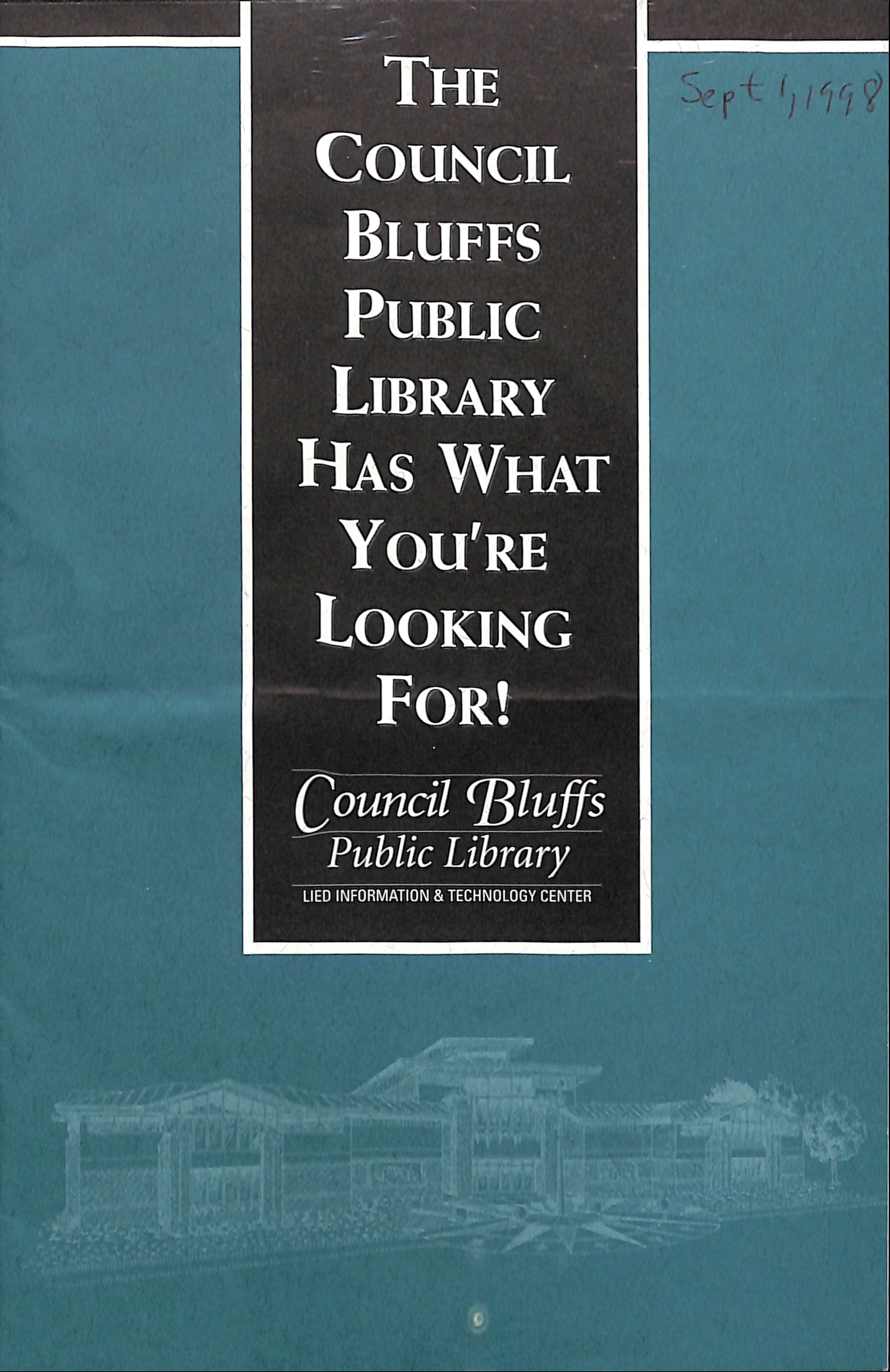 Twenty-Five Years of History A Dream Becomes Reality - Council Bluffs Public Library Twenty-Fifth Anniversary Oral History Interview - Dianne Herzog Twenty-Fifth Anniversary Oral History Interview - Edward Lynn Twenty-Fifth Anniversary Oral History Interview - Mary Carpenter Twenty-Fifth Anniversary Oral History Interview - Matt Walsh Twenty-Fifth Anniversary Oral History Interview - Warren Weber Construction at 400 Willow Ave Upcoming Events There are currently no upcoming events. Dedication and Open House Funding Pledges - October 1996 Topping-Off - July 31, 1997 Topping-Off - July 31, 1997 Dedication and Open House Ribbon Cutting - August 8, 1998 Ribbon Cutting - August 8, 1998 Library Brochure from September 1998